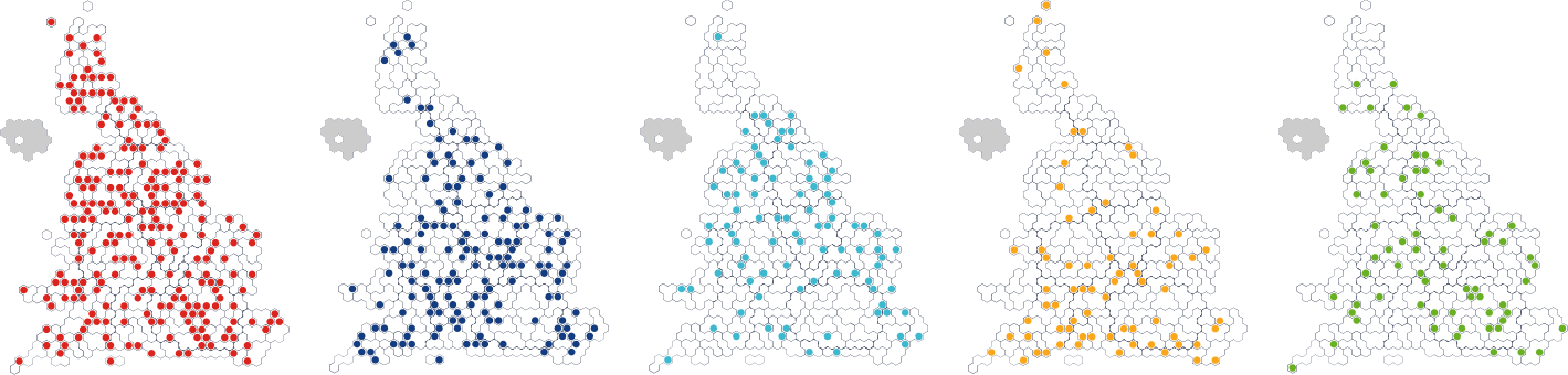 For the AMS model with a 68:32 ratio of constituency to list seats, a different methodology was applied. We used smaller regions than those that were used for the AMS 50:50 model and we tried to use areas reflective of historic geographic units, such as English counties. The number of FPTP constituencies within these smaller areas were calculated and then of these, approximately two-thirds of the total FPTP seats within a region assigned to be FPTP seats and approximately a third assigned as top-up seats. For example, if there were ten FPTP seats in area, for the purposes of our AMS 68:32 model, there would be seven FPTP seats and three top-up seats.